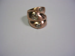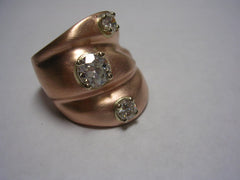 Redesign of client’s mom’s classic prong cocktail ring in white gold with three small diamonds. I bezel set them into this cigar band ring, but they didn’t sparkle the way she had remembered. We then changed the bezels to prongs, allowing the light to ignite the diamonds. End result: very happy client with modern ring in rose gold, which she loves, sporting her mom’s diamonds.